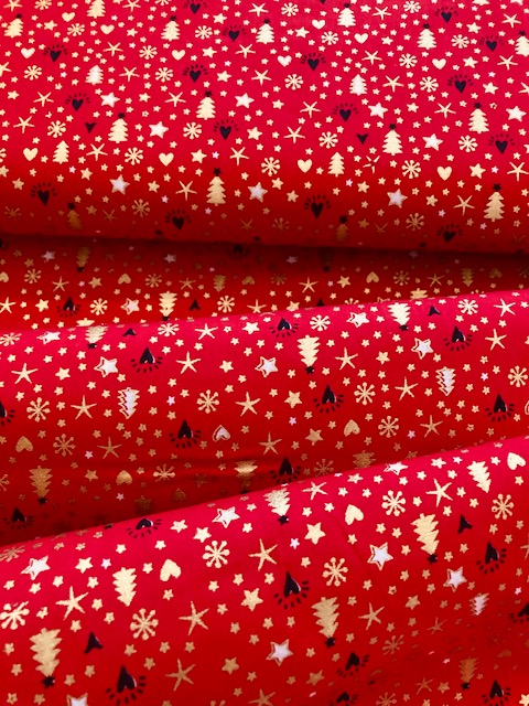 Niedlicher Weihnachtsstoff mit weihnachtlichen Motiven wie Tannen und Sternen, gepaart von kleinen schwarzen Herzen. Perfekt geeignet zur Verarbeitung von weihnachtlicher Dekoration wie Decken, Kissen, Taschen und Beuteln…