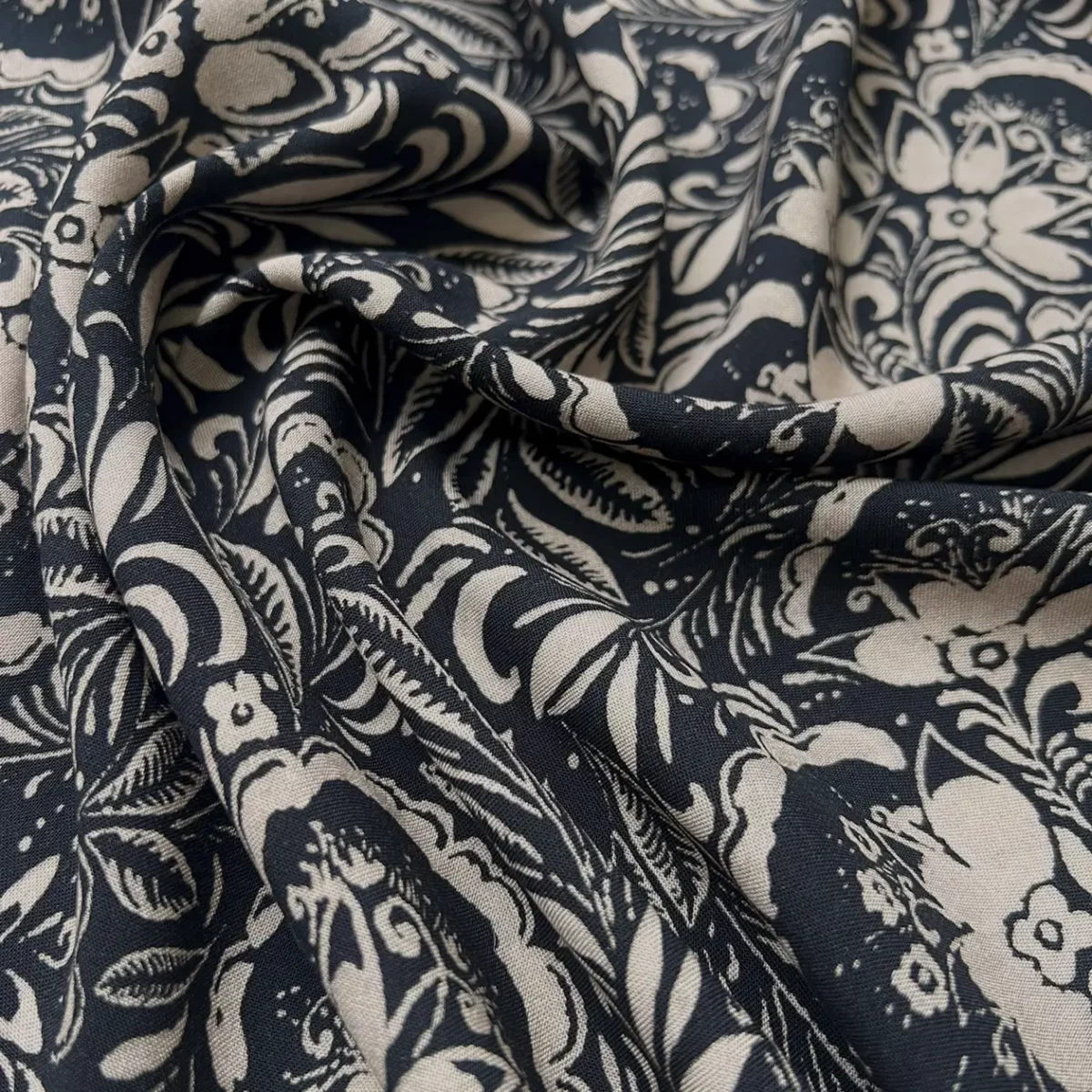 Viscose Maarinsky aus der neuen Winterkollektion von Cousette, ist ein weich fließender Viskose-Crêpe mit einem stilvollen, floralen Muster. Die harmonische Kombination aus anthrazitfarbenen Blüten auf beigem Hintergrund, verleiht dem Stoff eine besonders edle und zeitlose Ausstrahlung.