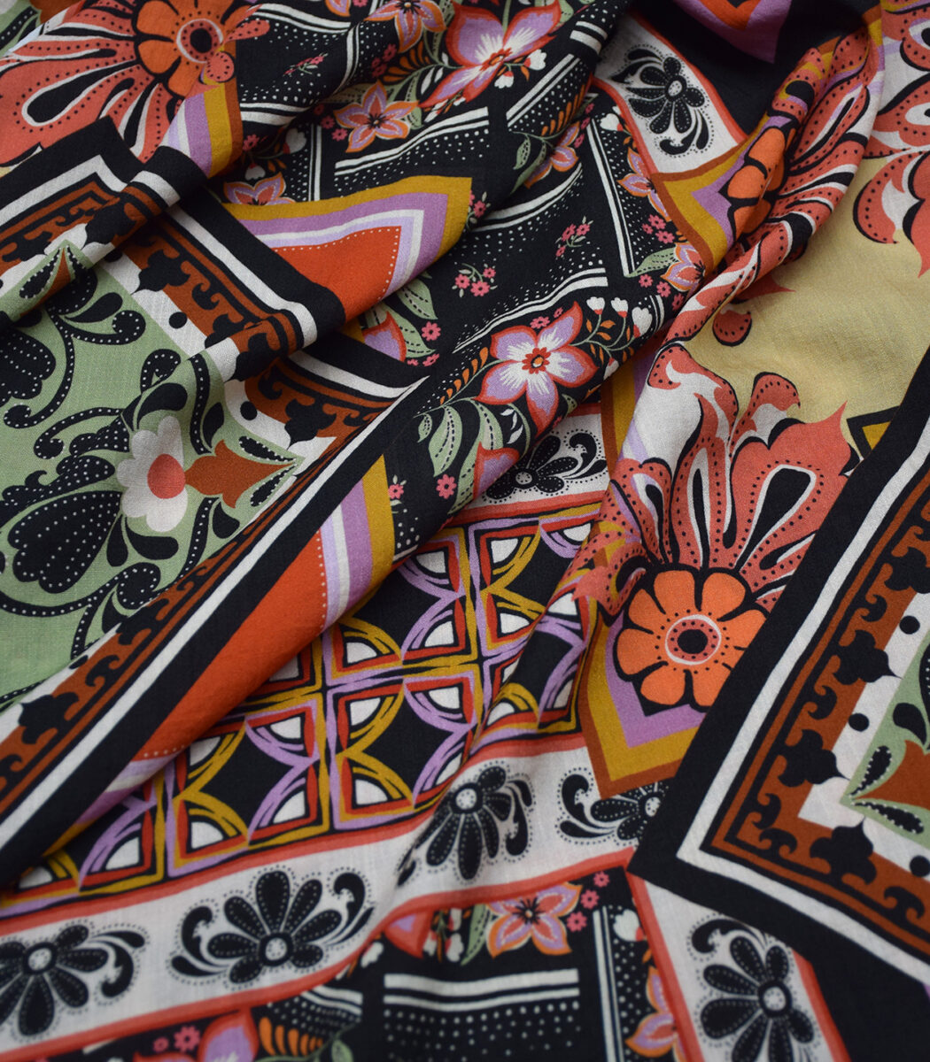Viscose-Crêpe Epos ist ein wunderschöner Stoff mit einem lebendigen Design im angesagten Boho-Style. Warme Erdtöne treffen auf kräftige Akzentfarben und verschmelzen zu einer harmonischen Farbwelt. Unterschiedliche Muster mit floralen Elementen und ornamentalen Details überlagern sich plakativ und schaffen einen spannenden, künstlerischen Look.